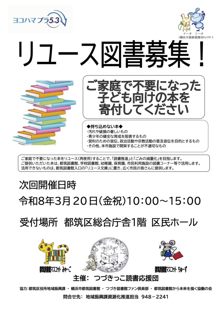 本をリユースすることで、「読書推進」と「大量廃棄物の減量化」を目指します。リユース本は、学校図書館・幼稚園・保育園・市民利用施設等で活用します。活用できないものは、都筑図書館入口の「リユース文庫」で市民の皆様に提供します。