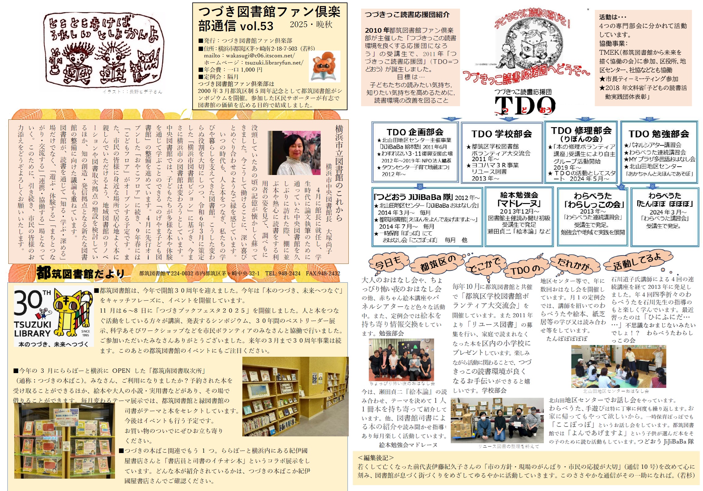 つづき図書館ファン倶楽部通信 つづき図書館ファン倶楽部通信・最新号のご紹介です。 バックナンバー ・vol.53 2025年・晩秋号 202512-vol53-01 202512-vol53-02 ※画像をクリックすると拡大します。>> vol.53 PDF版 1-4面 2-3面